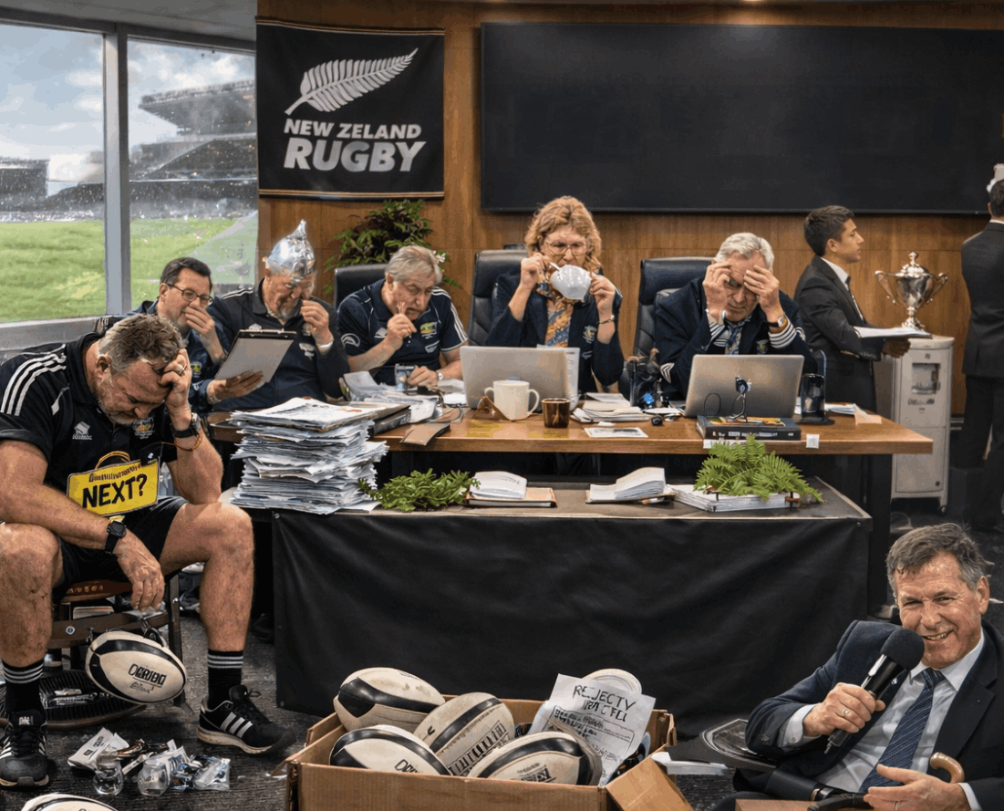 Now we arrive at the temple of black jerseys — the All Blacks. Normally this is done in a quiet boardroom. A nod. A handshake. A polite leak to the Herald. Finished.